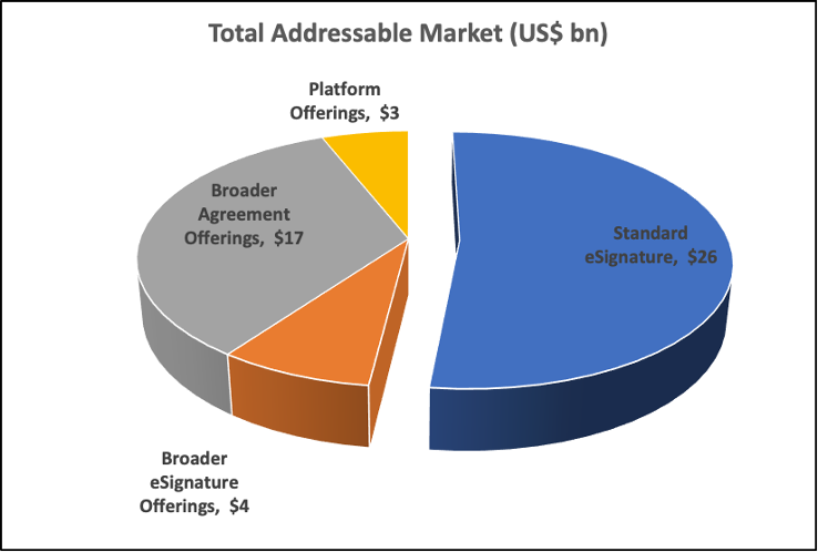 The eSignature market has several attractive features. It is a large and growing market. This, along with the product's simplicity, allows eSignature companies to quickly build a sizable sales footprint.