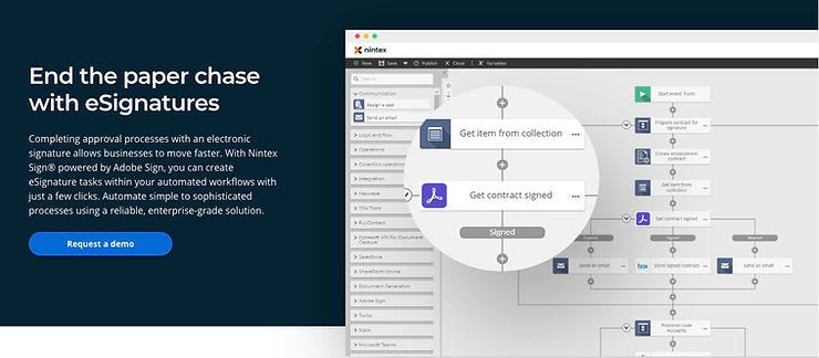 Note the similarities to digital transformation described in the previous section. K2’s acquirer Nintex itself incorporates eSignatures (using 3rd party provider Adobe’s eSignature product though Nintex recently acquired its own eSignature provider AssureSign) into its workflow automation solutions as shown below: