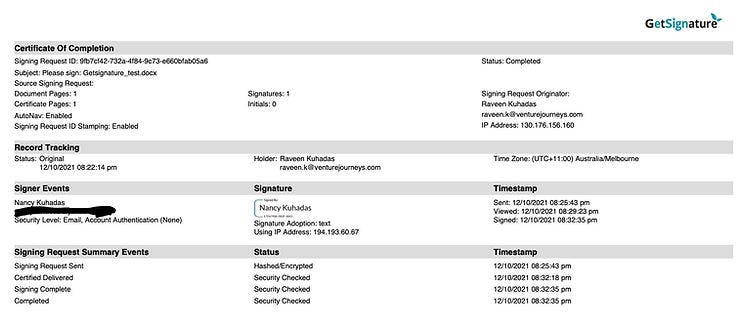 This also allows for an audit log or system of record that is court-admissible. GetSignature’s Certificate of Authenticity contains an audit trail that records any action that occurred with a verifiable time stamp.